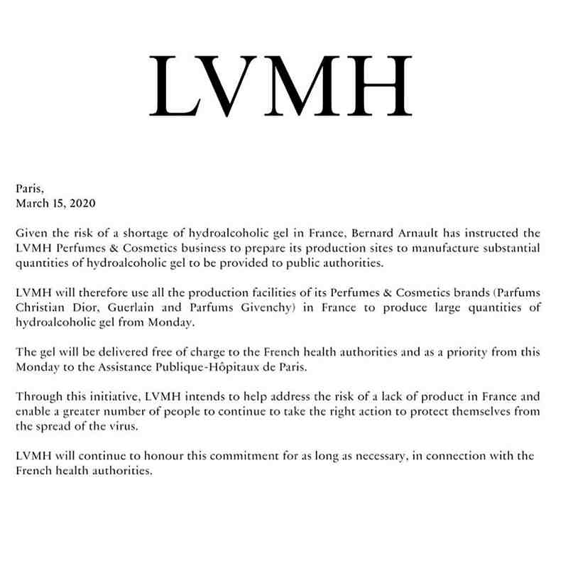 法国奢侈品集团路威酩轩(LVMH)3月15日宣布,将该集团旗下品牌迪奥、纪梵希和娇兰的三条香水生产线改为生产洗手液及其他消毒产品。所有消毒产品将不贴牌,并免费提供给法国卫生机构和欧洲各大医院系统。