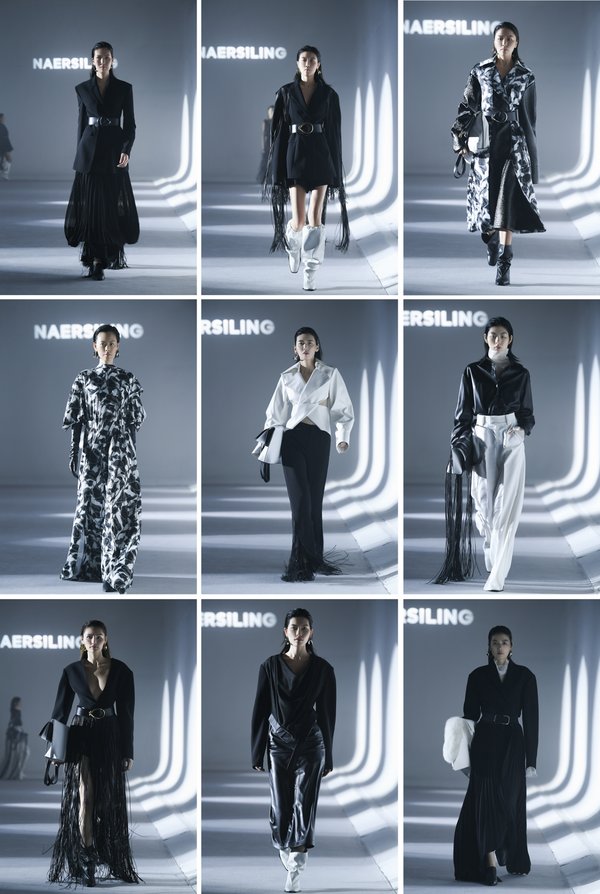 无论发布秀的呈现形式如何变化,核心价值依然离不开产品和设计。本次大秀在保持 NAERSILING 一贯的高品质和简约风格的基础上,以极光白、幻影黑、远空蓝为主色调,重点通过宽肩造型、不对称解构艺术等设计手法,体现犹如城市建筑般线条分明、硬朗与温柔平衡的造型,完美演绎都市 LADY 的多面形象。其中,不论是自由随性的摇曳流苏、摩登前卫的网孔面料、亦或是提取品牌花-马蹄莲作为的设计元素,都呈现出设计师的匠心独运,传递自由、简约、摩登的美学理念。