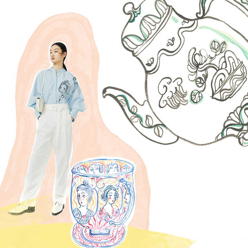 在纽约时装周上的首次合作,龙荻将中国元素以轻松肆意的方式融入时装之中,笔触更放松、色彩更自由。而这个春季,更贴合当下社会现实的四幅作品在她笔下诞生,《看展的女人》、《抱猫的女人》、《涂口红的女人》、《出游的女人》,看似极为平凡的场景,却在疫情之下显得弥足珍贵。