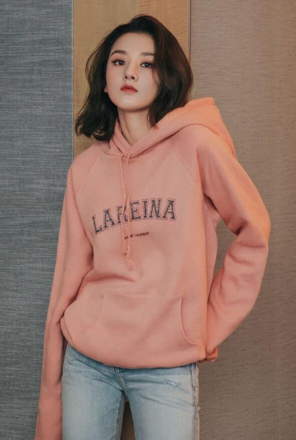周雨彤身穿SAINT LAURENT 卫爱之名个性化定制连帽卫衣