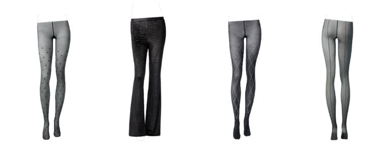 永恒经典裤袜系列代表着品牌标志设计,有各式各样的印花,譬如点缀星形图案的丝袜,是经典波点连裤袜在细节上的新延续,时髦与优雅并存。此外,其他款式如千鸟格连裤袜搭配花卉拼接,后线连裤袜脚踝点缀蝴蝶结设计,以及布满蝴蝶结印花的连裤袜, 该系列连裤袜让上身效果极具女人味。如今打底裤已成为复古潮流的重要一环,是每个女人的衣橱必备单品。新系列推出不同风格的打底裤,延续基础款式的同时突出细节设计,更好的塑形修身。这款复古80年代风格的微喇紧身裤将继续成为本季大热的潮流穿搭单品;基础款牛仔裤点缀树叶刺绣辅以亮片效果,黑色塑性打底裤突出腰部设计感和点缀金色纽扣,加入踩脚的细节设计,提升视觉冲击感并增具风格。