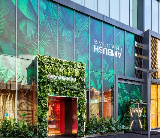 宝格丽MAXI LOGO限时精品店颠覆常规设计,在当代美学的指引下,宝格丽将自然之美与人类创造力巧妙结合。店外茂密的雨林装扮,宝格丽灵蛇穿梭于自然世界,呈现出灵动的魅力。漫步店铺内,郁郁葱葱的背景充满了活力,品牌携手AMBUSH创意总监Yoon联合推出的AMBUSH X BVLGARI特别款联名手袋及配饰系列坐落于橱窗及柜台。环绕的龟背竹、旅人蕉、加州蒲葵展现无限生机与可能,而色彩缤纷的手袋宛如雨林中可口的果实,点缀了整片雨林。