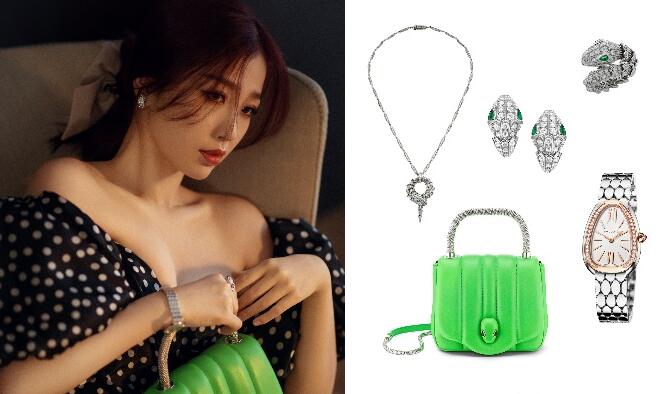 THE9虞书欣佩戴宝格丽Serpenti系列项链、戒指、耳环,Serpenti Seduttori鎏光蛇影腕表及AMBUSH X BVLGARI系列亮绿色小羊皮手提包甜美现身。