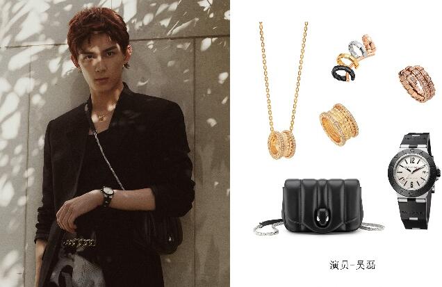 吴磊佩戴宝格丽B.zero1 ROCK项链、戒指,Serpenti Viper系列戒指、耳环,ALUMINIUM腕表及AMBUSH X BVLGARI系列黑色小羊皮腰包帅气亮相。