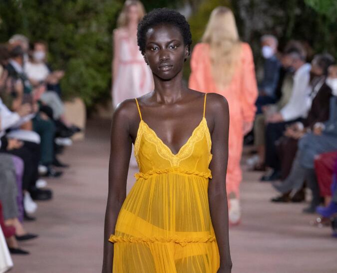 Alberta Ferretti 2021 春夏系列于米兰发布。设计师 Alberta Ferretti 女士提到,“时艰之下,时尚不应就此停摆,或者自我放任。反而应该重拾其重要的记录功能,留住时代的烙印。也正是当前的特殊情况,激发着每一个人发挥最大的创造潜能。我的第一反应是以善意来回应时艰,就像浪漫一样,善意是力量的化身,而非软弱的表现。这就是我设计本季的初衷,想要传达女性在悦己之时流露出的天然女人味。”