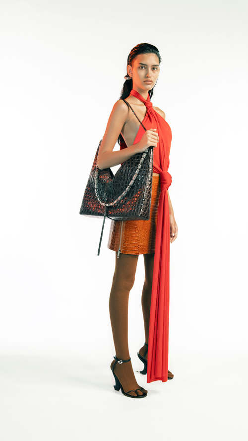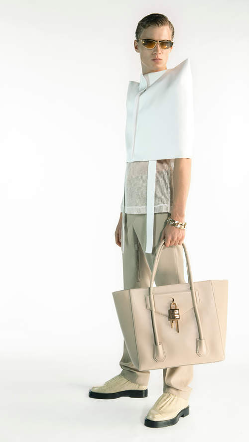 本季致敬了品牌过往的经典与先锋设计,从 Hubert de Givenchy 先生所设计的大面积环状褶皱幔帐、空气感透明材质面料、颈部流线型剪裁以及镂空后背的设计,到 McQueen作为品牌设计师时期的“羊角”造型等。创意总监 Matthew M. Williams 以一种优雅、有趣又充满实用主义的方式将他们一一呈现,同时也象征着 Williams 对于品牌未来的憧憬与期望。全新系列以既轻松又郑重的方式将品牌的过去与现在重新诠释,谱写出一段关于时代的演变历程。系列中三分趾设计的鞋履与袜饰、羊角元素的高跟鞋与帽饰,以及对 Antigona 系列手袋的全新演绎,都是对品牌珍藏于档案馆的产品进行的深层次革新与创作。一款全新推出的中性风格手袋男女皆可使用,作为纪梵希手袋家族的新成员点缀在系列中。手袋设计经过数次雕琢,拥有考究的剪裁并搭配精致的字母“G”金属链条。
