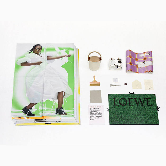 墙上秀场以一本超大艺术作品档案夹的形式包装,一张摄影师Steven Meisel此前发布于1999年意大利版《Vogue》杂志的图像,经由丝网印刷转印至档案夹正面。档案夹内部存放着一系列折叠海报,并配有一只帆布工具包,包内装有一卷由Anthea Hamilton设计的壁纸、一卷带有本系列所有造型的壁纸边框、壁纸胶水、一支刷子、一把剪刀、一枚带有甜菜根味香氛的陶盘、一份目录册。作为补充,作品集还包含了一首四十声部的主题曲的纸质乐谱——The Talis Scholars 合唱团的《别无寄望》(Spem in Alium)