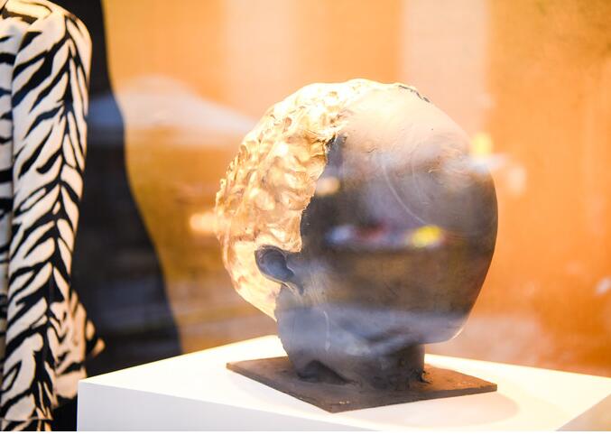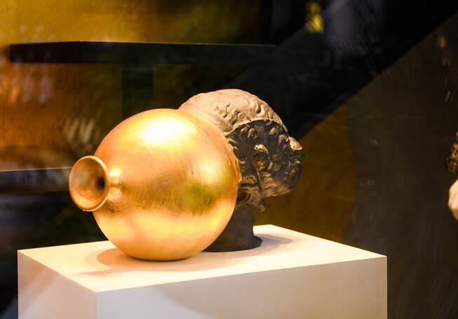 橱窗背景色彩与材质对比强烈,大面积⿊陶和⾦箔的运用,灵感源于艺术家经典雕塑作品系列《往里看》中的一具雕塑“维纳斯”,他以向内观照的东方文化视角重新阐释了西方经典雕塑头像。背景模拟艺术家作品中维纳斯的脸部与头发的轮廓,材质层叠延展,延伸出对女性之美的哲思与想象。