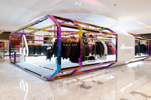 Moose Knuckles全新北京SKP限时精品店以全钢质结构打造,整体框架饰以炫彩镜面效果,在灯光下从各个角度折射出不同的光彩,恍若美轮美奂的极寒美景中传递出我们对保暖品质的无尽追求。限时店内中心以19块LED屏幕错落叠搭的电子装置,滚动播放Moose Knuckles2020年秋冬系列全新广告大片,营造新奇沉浸的视觉体验,引导顾客全身心体验Moose Knuckles的炫酷世界。
