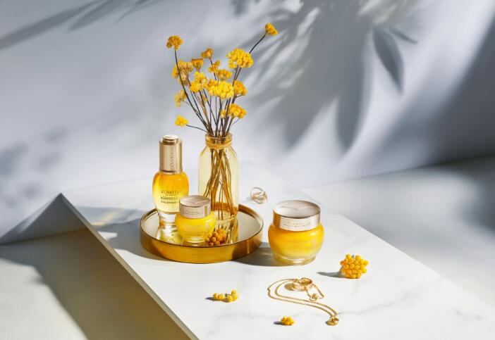 每年6月,南法科西嘉岛会绽放满山遍野的腊菊花,因其经采摘后数年都不会凋零,被誉为“黄金不调花”。欧舒丹在全球500多种腊菊中,甄选出抗老传奇南法科西嘉腊菊,20年精研双重等离子净萃工艺加持,提炼高能植物A醇[footnoteRef:1]1。成就全新升级「欧舒丹第4代赋颜御龄系列」,温和舒展肌肤轮廓,高效抚痕驻龄,定格肌肤年轻状态。