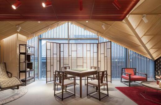三楼家具空间为呼应成都远洋太古里的川西风格青瓦坡,配以大面积的玻璃幕墙,以穿插现代的手法营造出一片开放自由的家居空间。通过红色及竹色金属格栅的组合,抽象地回应四川当地建筑的悬山意像。