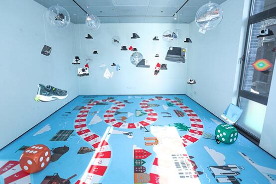 值得一体的是展览末端的两处互动性体验区域,将非售卖的宝丽来相纸概念投射到一面镜子之上,整体视觉好似一个实体相纸,趣味性十足。而旁边的“大富翁游戏”则被改编成了世界地图版本,祁卷卷所涉足的24个国家也身处其中。屋顶错落有致的悬挂着宝丽来相机和装在透明球体中的“特步”运动鞋,通过骰子滚动触发头顶相机,如果恰巧站到真机的位置即可拍摄留影,体会在一个迷你版的世界中云游四方。