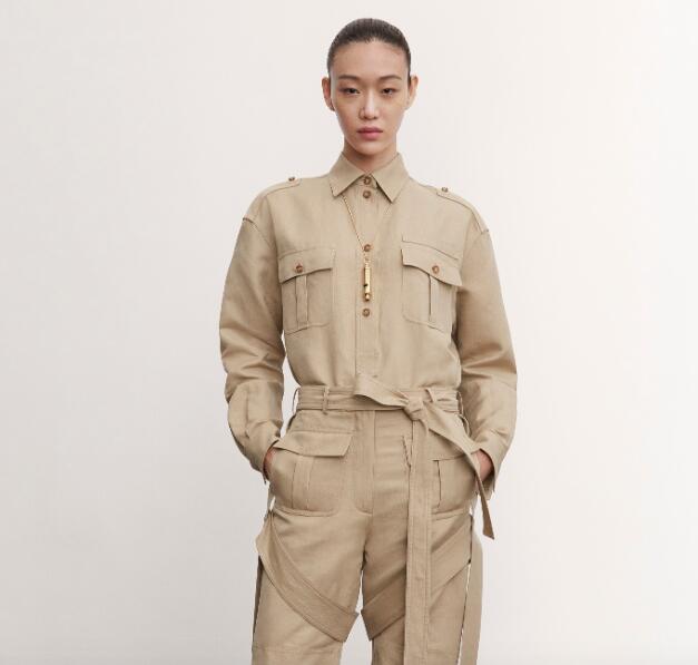 紧身连衣裙,贴身短裙和镂空立体量裁长裤。饰有夸张口袋的羊毛斜纹阔腿连身衣,徽章嵌花短袖衬衫。