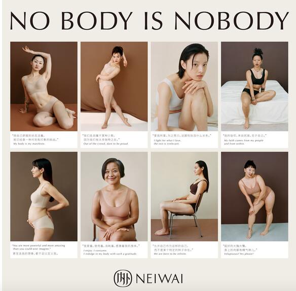 NEIWAI内外作为国内率先提倡真实多元审美的品牌,已于2020年2月以“NO BODY IS NOBODY | 没有一种身材,是微不足道的”品牌项目开启关于女性身材多样性的讨论,通过一系列深度纪录片及社交媒体话题互动,持续引发广大女性的关注与共鸣。