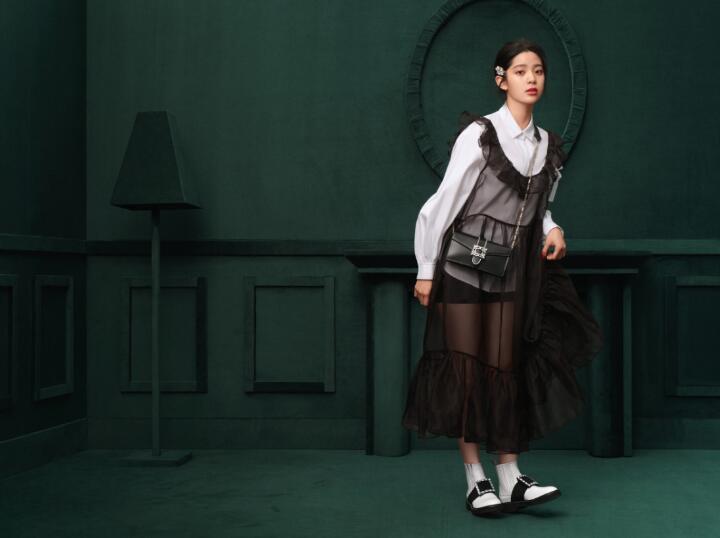 新一季广告大片以粉色、红色及绿色的丝绒房间作为背景,娜娜穿梭其中,洋溢或成熟优雅或清纯甜美的浪漫气质。唯美的粉色丝绒房间中,娜娜以Vivier Slide钻扣穆勒鞋搭配Mini Vanity日装包,顾盼间尽展俏皮姿态;迷人的红色背景下,酷感的Walky Viv’ 钻扣鞋履与精致的Miss Vivier钻扣日装包碰撞出不一样的个性风格;浪漫的绿色丝绒房间里,娜娜以多款优雅单品诠释维维亚女孩的左岸风情。