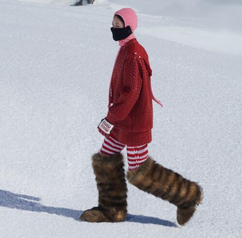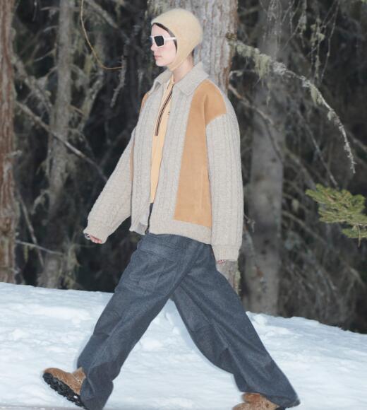 运动语言与时尚理念交织重叠,实穿亦前卫。登山着装风格契合山间景观。人造泰迪熊皮草、加衬层里、针织滑雪头盔和滑雪面罩贴合面部轮廓,暗示温暖与安全,赋予险峻地带防护物品以美学意蕴。丝质缎面连衣裙和蕾丝传达微妙与亲密感。外套,即是内在生活写照。
