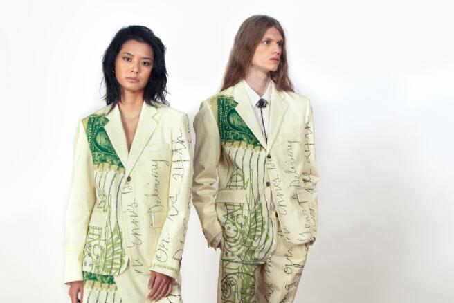 同时,品牌在此次2021年秋冬时装周上推出了首个女装系列。牛仔短外套剪裁修身,配以不对称纽扣,与延续了男装廓形和剪裁的西装外套大衣形成鲜明对比。牛仔裤则借鉴了男装风格,带给人粗犷休闲的感觉。明信片图案印花也由男装系列延续到了女款西装外套及半裙的设计上。