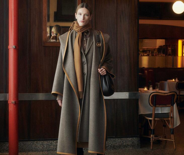 配饰:包包、鞋子和珠宝使成衣中的层次感、结构感和柔软感更加丰满,本季饰品注重细节设计。项链均采用了项圈式设计,如一条蛇形链、一个由不同纽扣组成的项圈以及一条金珠项链,灵感来源于Tory佩戴过的add-a-bead项链。这些均可与高领毛衣和针织衫进行搭配。品牌标志与廓形均于本季进行了迭代。Eleanor包袋的颜色与成衣相辅相成,而Lee Radziwill包袋则呈现出一种更细腻的西部气息。本系列的151 Mercer hobo 新包袋和151 Mercer 月牙形包袋,一个解构化,一个结构化,都反映了纽约下城的精神与氛围。