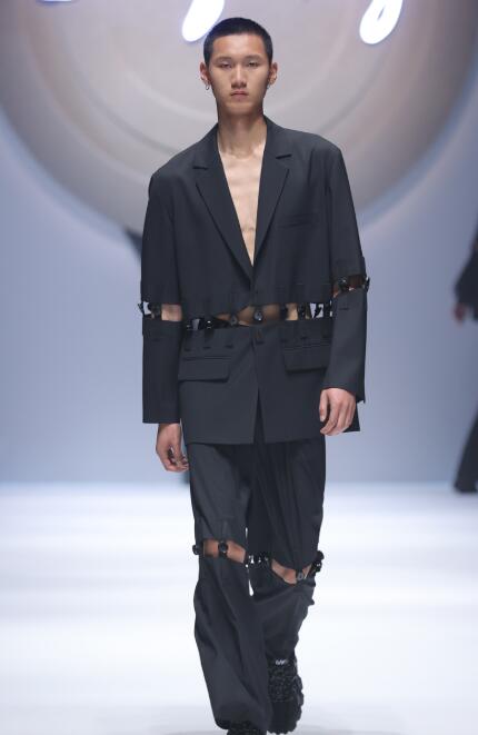 这场大秀是设计师自我博弈和自我突破的呈现,T台上那些看似清冷的着装,包裹着每一个热情的灵魂,每一套look都延展出无限的可能,重新解读人与衣的联系、古与今的传承、中与西的结合、现代与未来的交织。如果说上一季的主题“纽扣”是传承的纽带,那么这一季的主题“结”则是缘分的羁绊。在“结”系列中,设计师将中国传统“盘扣”通过时尚化的现代工艺重现,既有传统之美,又与当下的流行完美相融。秀场look中无处不在的“结”,让服装的各部件与身体巧妙地连在一起,构建出富于变化的造型。“结”也寓意着“连结”,当疫情的阴影逐渐消散,设计师也以“结”为载体,传递人与人之间相互温暖、携手共进的美好愿景。