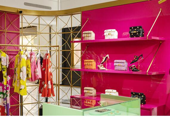 限时概念店的设计灵感源于罗马建筑,亦是向经典罗马铆钉元素的一次致敬。店内的金色挂架, 搭配薄荷绿色的地板与酒红色的墙柜,色彩对比强烈, 复古又不失优雅。
