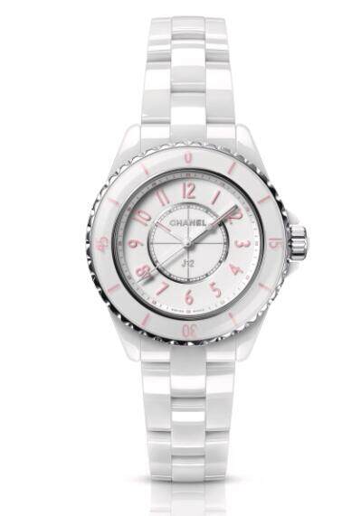 J12 Pink Blush腕表以淡粉色点缀指针与数字时标,尽显几何美感,精致而柔美。