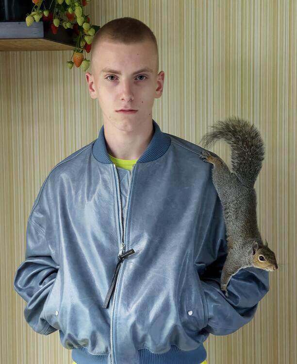 延续了疫情之初便首次设立的主题,Jonathan选择以一种物理方式呈现这两组系列。这一季选取了33张不同尺寸大小的打印海报,这些海报都带有硬纸板的照片边框,这些边框也有各自不同的尺寸。“我的创作理念是想要让人觉得有点像是又回到了学校,”Jonathan表示,“在我小的时候,我们经常在学校拍照片,你会看到这些拍出来的照片都会带有边框,我喜欢每张照片都能自成一体的那种感觉。你甚至还可以将照片摆到你家中的壁炉台上。”照片和边框都被一张定制的包装纸所包住,包装纸图案来自18世纪的一副画:一只啃着松子的松鼠,旁边有着一碗草莓。