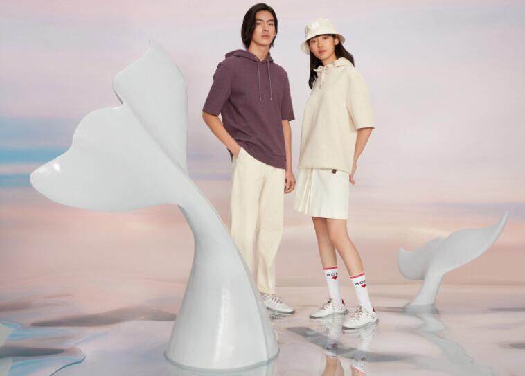 该系列主打图案的设计灵感来源于长江江豚灵动的身姿和标志性的天使微笑,包括一系列男女同款的成衣与配饰。独特的爱心图案结合江豚的微笑,以刺绣、印花和提花的方式呈现,代表心意的告白被融入到单品中。