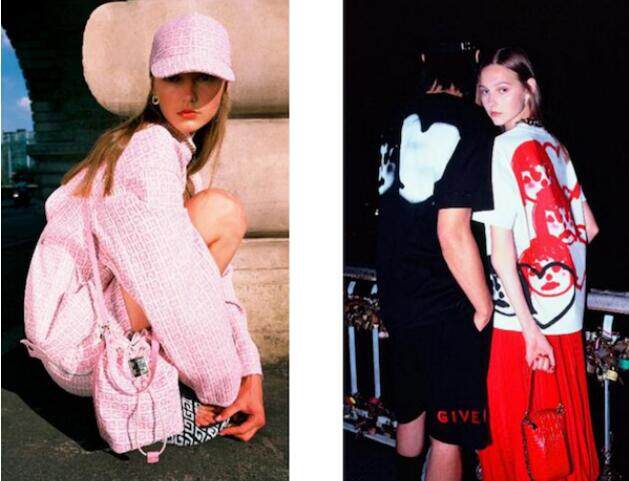 全新系列中的女士成衣拥有多种不同款式的印花与廓形。粉色与白色搭配的满 4G Logo 提花牛仔夹克,腰部装饰有别致的按扣,合上按扣,宽松而具有建筑美感的牛仔夹克便可成为一件收腰设计的修身夹克,系列中的粉白 4G Logo 提花无袖牛仔连衣裙,浅粉色短袖衬衫与 Givenchy Logo 刺绣罗纹连衣裙也选用了同样的收腰设计。创意总监 Matthew M. Williams 将 4G 金属元素注入其在纪梵希打造出的作品中,全新系列中红色超大号落肩针织开衫搭配 4G 金属挂锁,在七夕来临之际,致敬巴黎锁桥上的情人锁扣与晨昏交替时巴黎的曼妙景致。