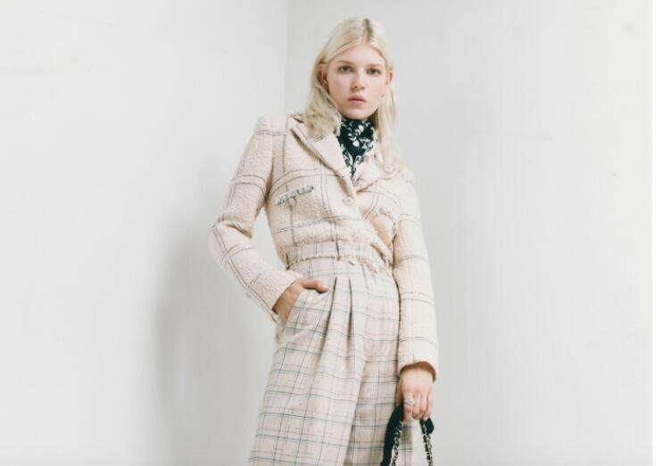 “这一系列有着非常强烈的70年代风格,带着些许朋克气息,同时融入经典的香奈儿元素,非常优雅。”她补充道。本系列强调对比的手法,从色彩(黑与白搭配粉色与深浅不一的灰色调)、材质(斜纹软呢、皮革、针织、毛毡、喀什米尔、法兰绒、绸缎与丝质),到造型的呈现。造型从中性风格中汲取灵感,例如配以宽领的超大号黑色羊毛与喀什米尔大衣、线条纯净利落的幻象连衣裙,与一款灰色短大衣,其色调令Ola Rudnicka联想到粗野主义建筑。而柔美细节依然无处不在:亮面白色皮革大衣搭配双C标志钮扣,内衬采用双面剪羊毛;斜纹软呢上则点缀以亮片。中性与柔美风格的结合,打造出系列摩登且闲适的造型。米色格纹斜纹软呢外套,下摆掖入极致轻薄的亮片法兰绒裤装,舒适至关重要,同时亦不失柔美。