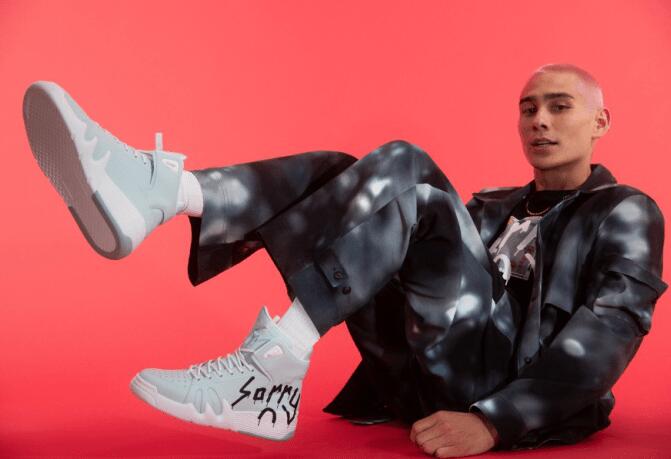 高帮运动鞋沿用了 Giuseppe Zanotti 经典 的TALON设计,采用了纯白和柔和色调的“黄油”色、嫩粉色和浅蓝色的皮革。 鞋的侧面以黑色颜料,喷印上 Evan 的涂鸦风格「Sorry」标志。