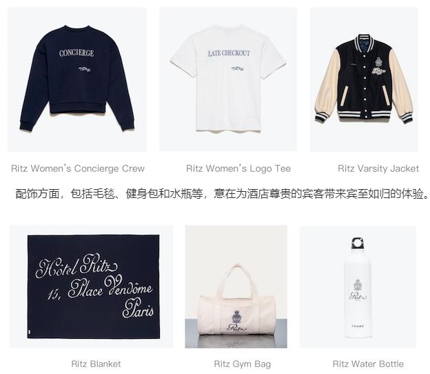 FRAME x Ritz Paris限量联名胶囊系列的灵感源自往来Ritz Paris酒店的宾客,将美式经典糅合毫不费力的法式风,全系列呈现精致兼格调的日常必备单品,从奢华羊绒到率性牛仔到T恤均印有酒店尊贵的徽章和logo。系列单品包括:礼宾部圆领衫和印有延迟退房的T恤,以及棒球夹克。