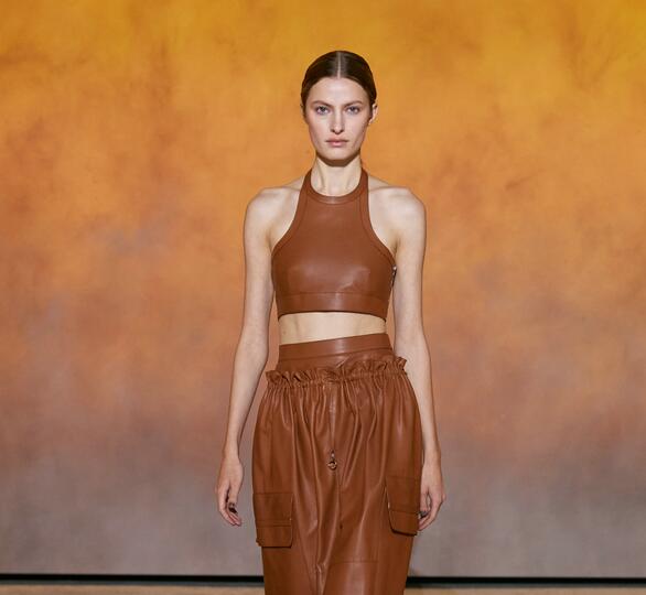 本季女士成衣展现女性柔和姿影。暖阳色调融于衣裙,衬托迷人肌肤的活力。干净利落的剪裁廓形与不同材质的相互结合,彰显独特质感。孔洞细节、收腰设计、皮革及珍珠铆钉元素等皆演绎自由的优雅姿态。