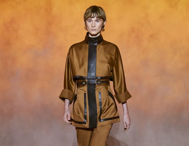 本季男士成衣回溯传统织物工艺并从中汲取选材灵感。Toilbrigh面料与棉布外层融合,错视元素的巧妙运用,续写无限创意;明丽色彩与柔和色调交织呈现,诠释沉稳内敛的绅士格调。缝线图案与质感皮革相映成趣,成就极致儒雅的同时,迸发蓬勃朝气。