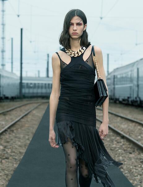 2022早春系列以极为精妙的设计夺人眼球,融合了力量感与精致结构的蜘蛛网元素展现出新颖有力的韵律美。由创意总监Matthew M. Williams打造的金属元素配饰更为纪梵希标志性的手袋增添点睛之笔。链条、金属串珠以及印花方巾的装饰使得服装与配饰更具个人风格,Chito设计的小丑涂鸦印花也化身为时装配饰,充满趣味且潮流感十足。精致纤细的水晶身体链点缀于极具建筑感,线条感且不对称的造型中,充满强烈的冲突对比效果。