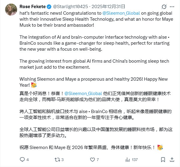 近日,一则看似普通的品牌新年祝福,在海外社交平台意外掀起一场关于“睡眠”的跨国讨论。起因是中国睡眠科技品牌喜临门于2025年12月31日在X平台(原Twitter)发布更名公告,并配文庆祝新年。这条动态被知名健康生活倡导者、梅耶·马斯克(Maye Musk)转发点赞,称:“好睡眠是健康的根本。”