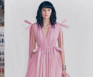 2021-05-19​本季聚焦精妙廓形、饱和色调、剪纸印花与解构拼接。一场服饰与自我个性的探索,刻画女性的多面肖像。 深V领抽绳连衣裙,饰以精致褶裥细节,露背设计,系以粉色水洗工艺涤纶塔夫绸缎带。 黑色羊毛斜