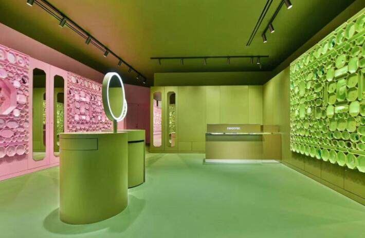 全新包装盒设计是品牌推出的浓墨重彩之笔, 这些迷人的包装为InstantWon der商店注入新鲜活力。包装盒分别有白、粉、绿、蓝和黄五种颜色,这些色彩的灵感源自光线透过仿水晶时散发的光芒。从地板延伸到天花板,整个墙面由八角形装饰盒打造,体现强烈单色冲击、重复图案的效果,鼓励消费者不断探索,衷千发现创作。