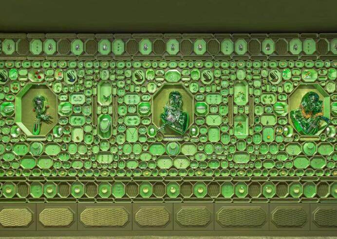 整体Inst ant Wonder的设计旨在将来宾引入一个感官零售空间, 其中充满活力的色彩、纹理,以 及创新材料相得益彰 , 鼓励大胆好奇和自我表现。八角形是InstantWonder门店的重要特征之—,用以致敬施华洛世奇的仿水晶工艺,并加强品牌意象化。外部八角形寓意”重生、无限、革新”及施华洛世奇经典的八角形切割——充满科技感的棱角分明与天鹅本身的柔美达成艺术平衡。